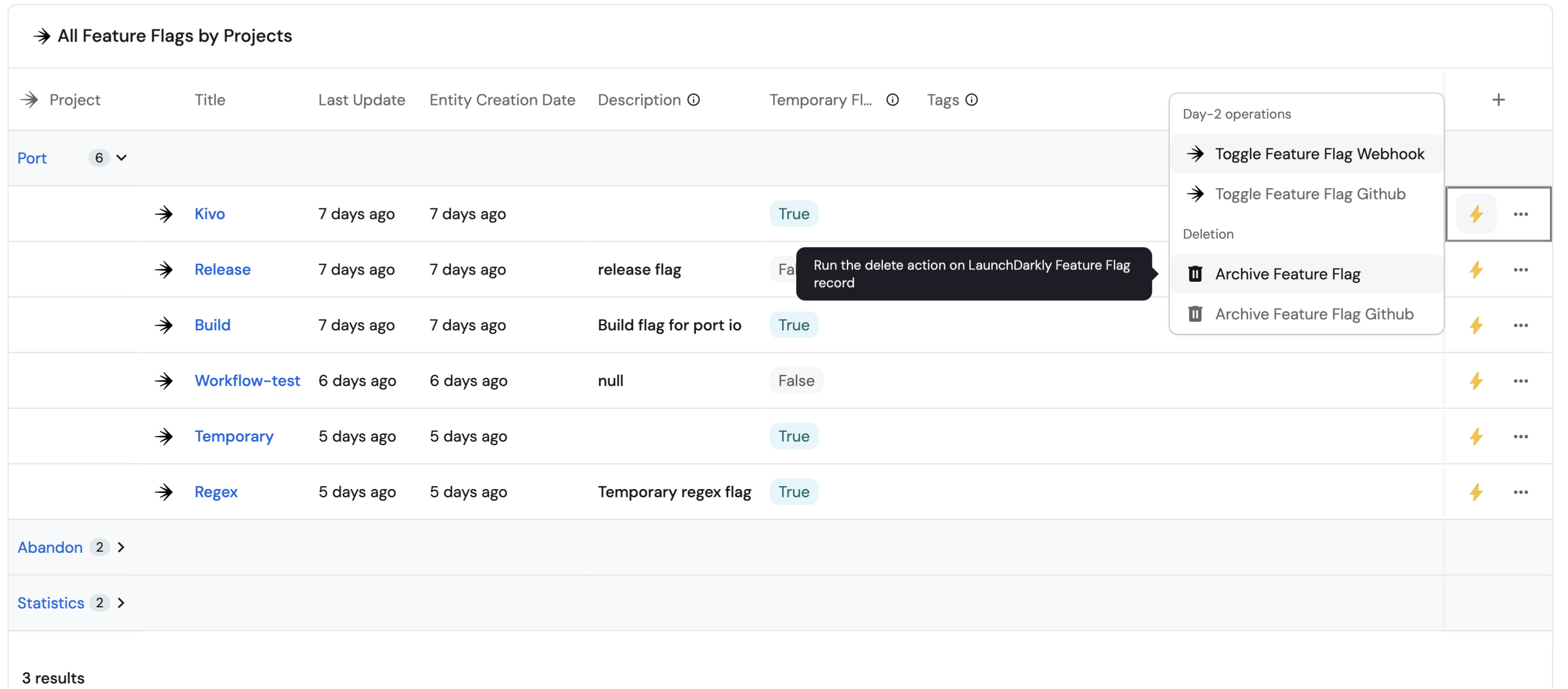 - Build dashboards in Port to monitor and take action on your feature flag resources.