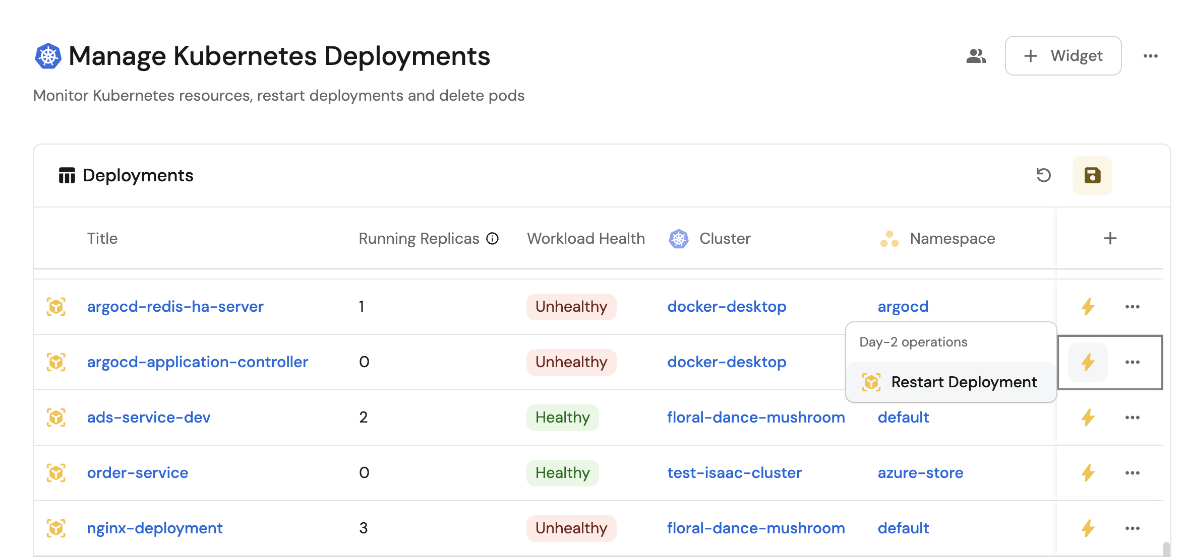 • Monitor the status and health of all Kubernetes deployments and pods across clusters from a single interface.